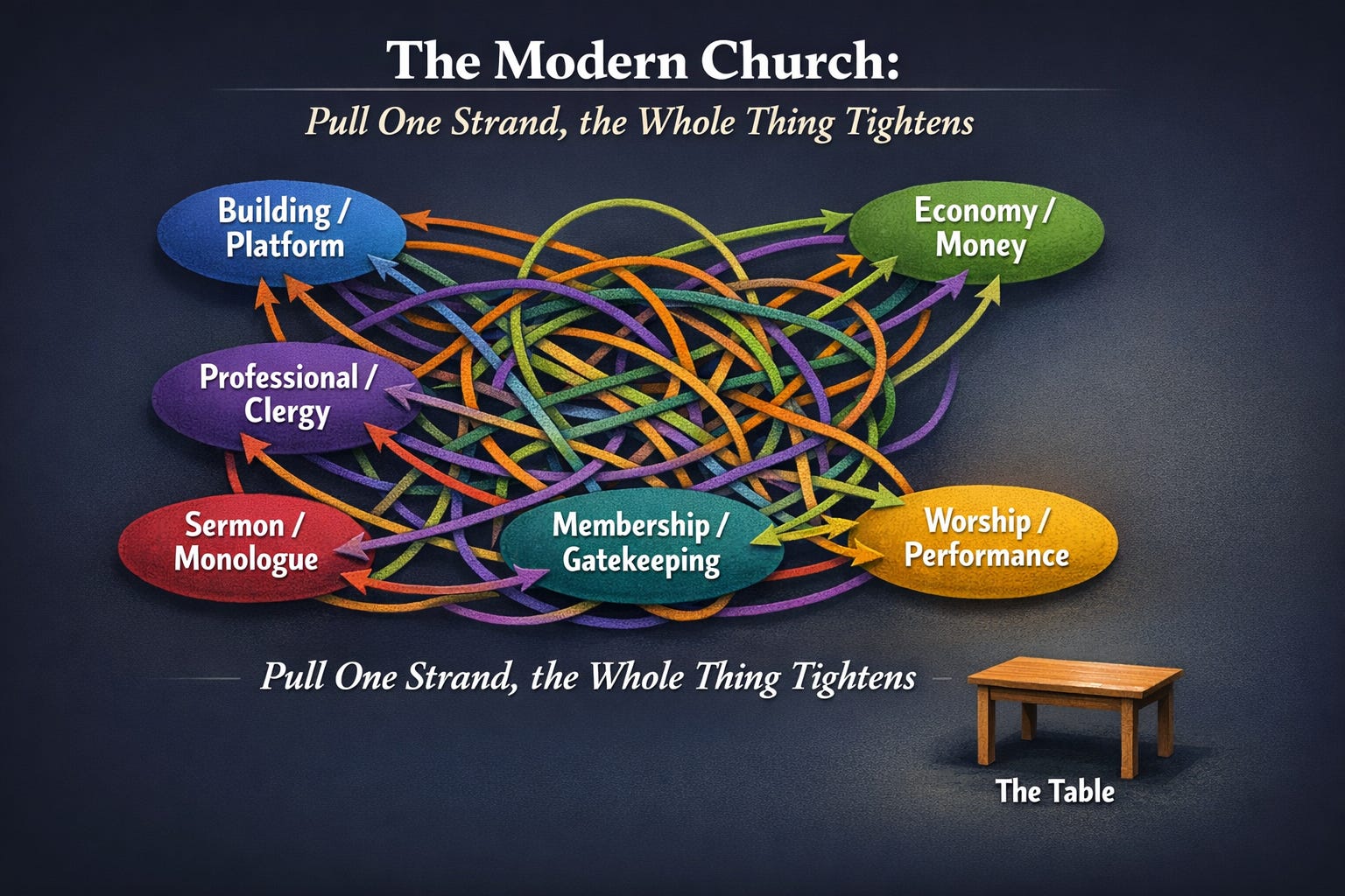 Accept the table, and you accept limits. Accept limits, and you reject the monopolized sermon. Reject the sermon, and you reject the professional. Reject the professional, and you reject membership. Reject membership, and you reject the building.